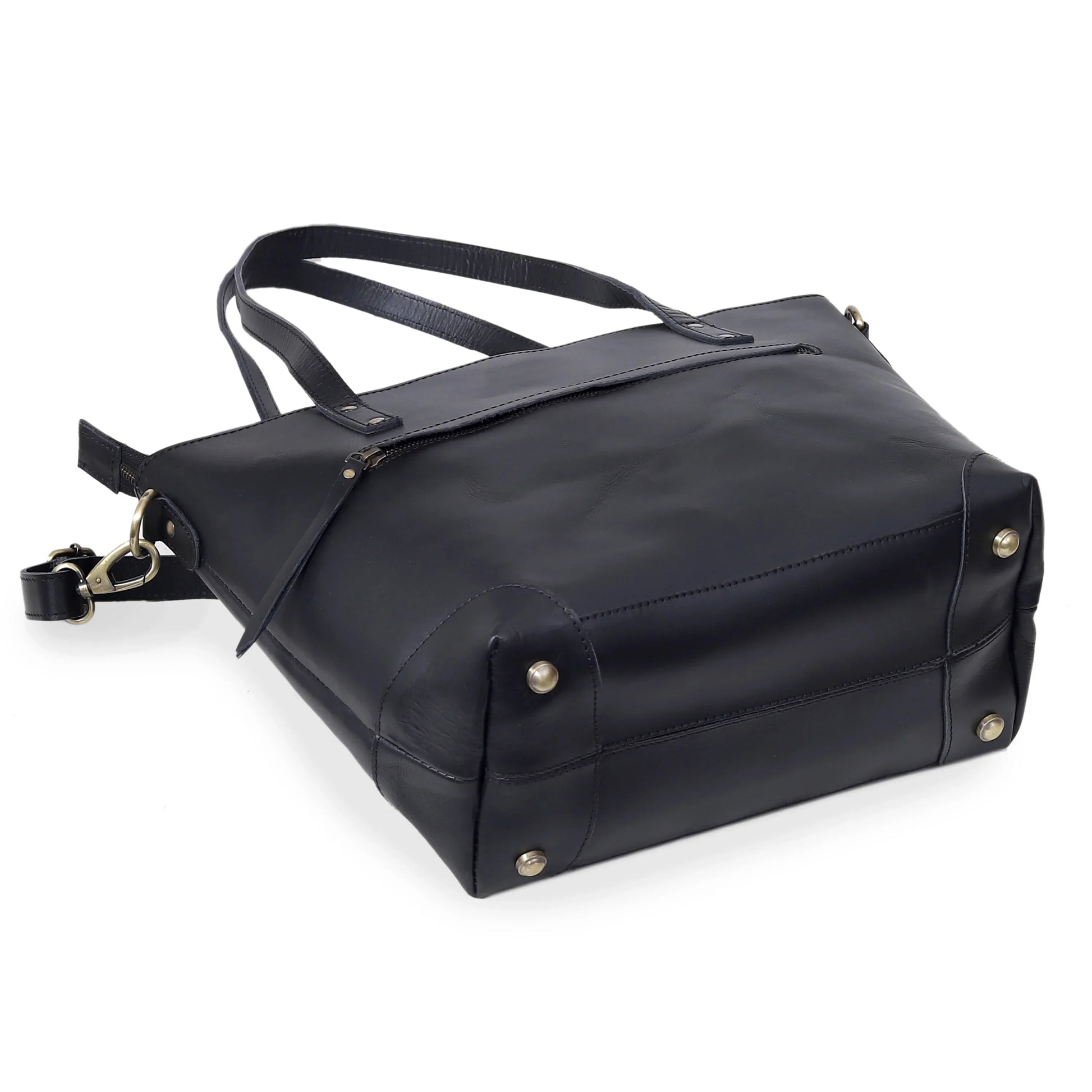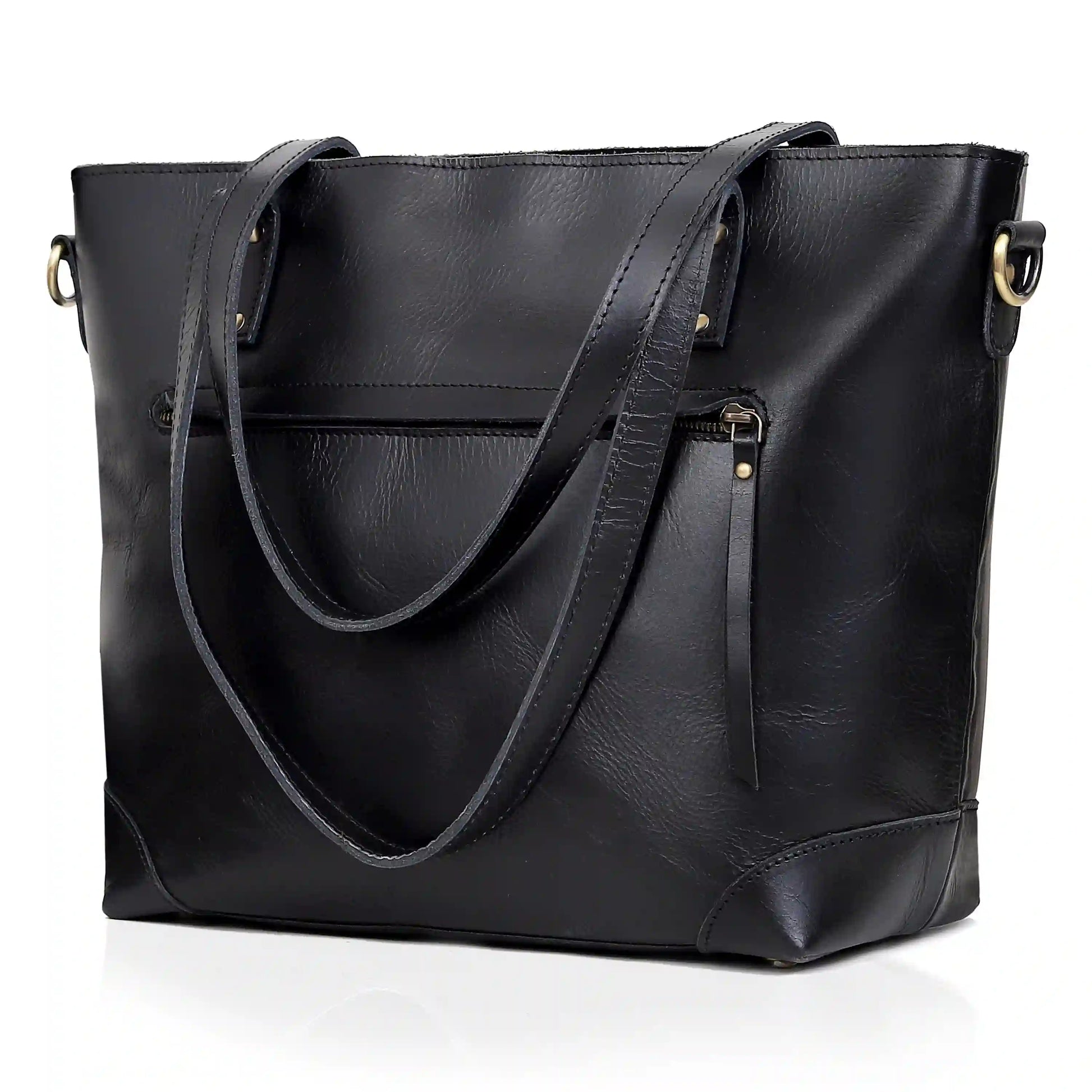 This women's buffalo leather tote bag has a distinctive natural aroma that mellows within days of use. The deep black tones are achieved through traditional, ensuring each bag has unique color variations and grain patterns.